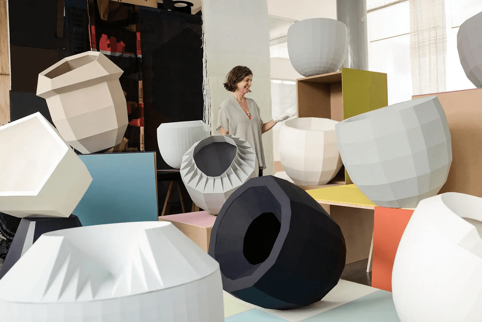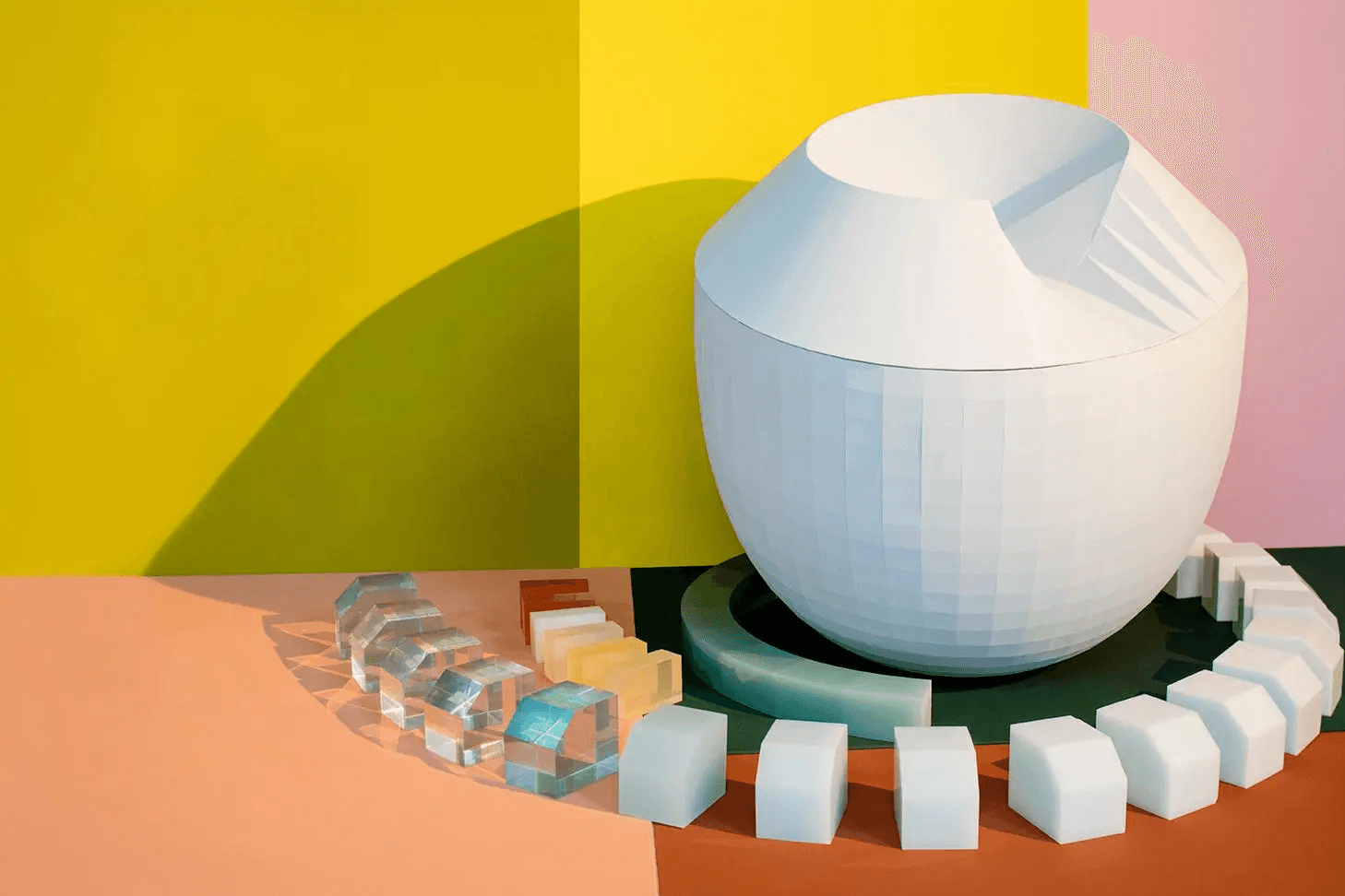 This becomes obvious with the noon area, where sculptural “colour catchers” of varying sizes — up to and including “architectural”— demonstrate the metamorphic effect of folds and facets. Suddenly the world seems turned on its head — form has become a function of shade, the power of colour overwhelming shape. And yet a circle of 300 glazed vases makes the opposite point: that it is fragile, too, and sometimes strangely imperfect. “We’re used to being given colour in industrial forms these days,” Alex Newson, the senior curator, says, “but really we can’t control it, as it’s inherently unstable. We’re showing how colours change and are alive and can flex and evolve.”