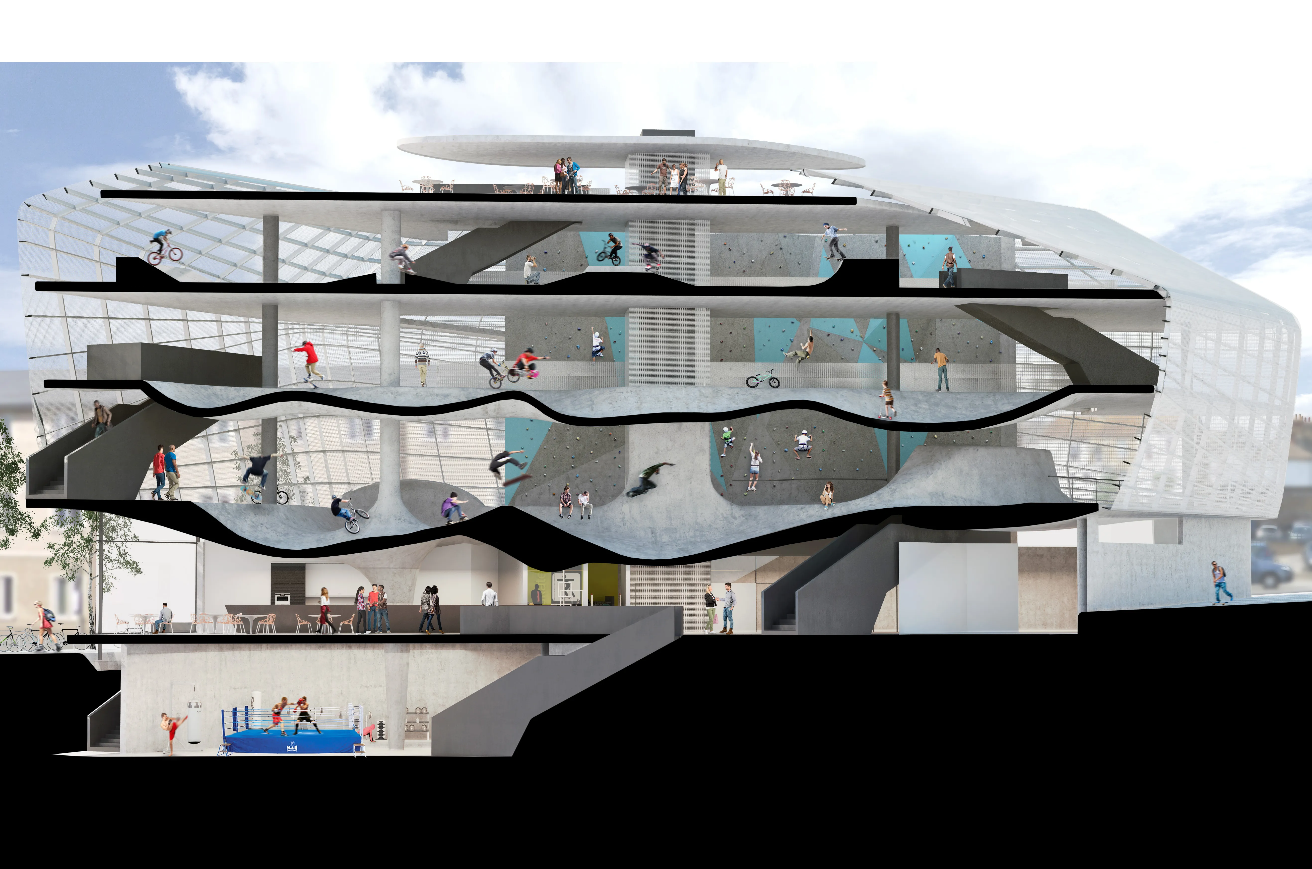 Billed as the world’s first multistorey skate park, this structure replaces a bingo hall at the centre of the Kent seaside town. It will comprise three floors of concrete ledges and ramps, which will be wrapped in a metal mesh and no doubt freezing in winter; a rooftop terrace with views over the Channel, which will also no doubt be freezing in winter; and a glazed ground floor with a boxing ring, offices, a café and a presumably very busy first aid station. It is hoped the unusual project will encourage young people to stay in the area.