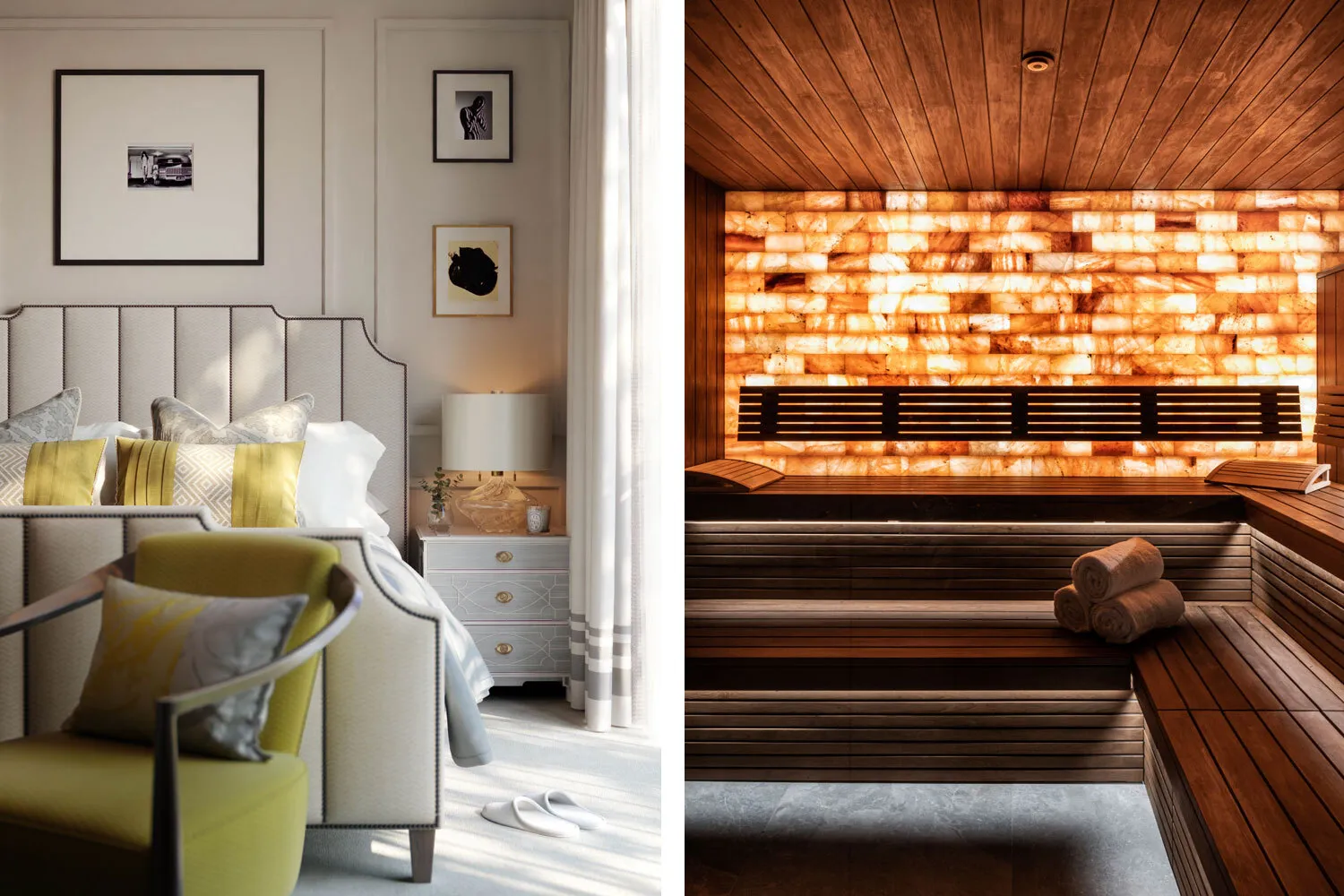 From left: a bedroom; the sauna (SIM CANETTY-CLARKE)